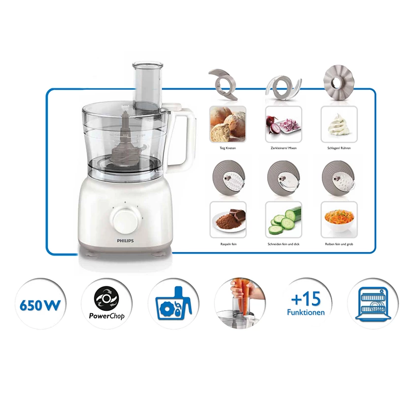 محضرة طعام متعددة الوظائف من Philips Daily Collection تجمع بين التقطيع، الخفق، العجن، والعصر في جهاز واحد عملي، مع خلاط منفصل لتحضير العصائر والمشروبات بسهولة. �